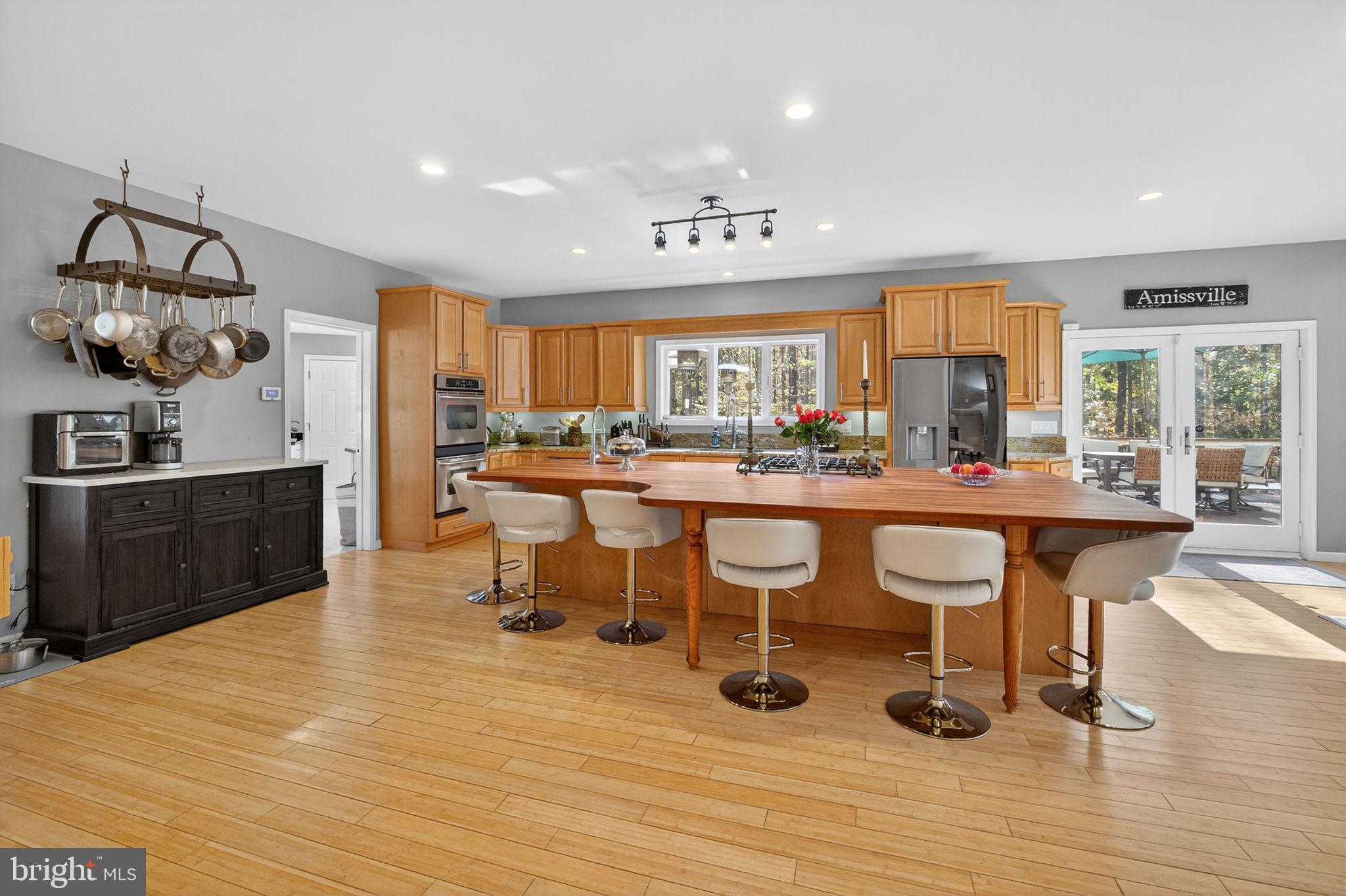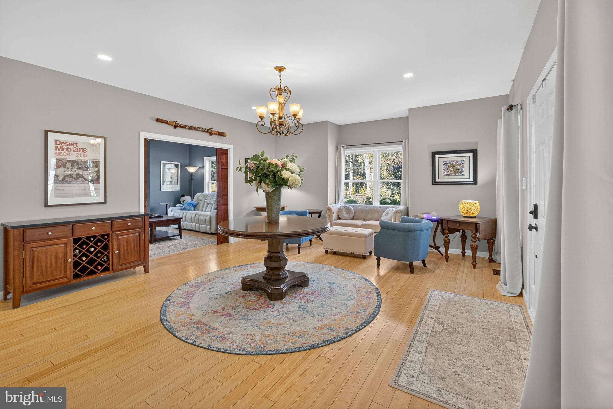 Set at the end of a tree lined lane, on nearly 10 acres , this three level 5800+ sf home enjoys a welcoming stone pillared front porch offering plenty of room for rocking chairs and seating to enjoy. The spacious front hall can hold a grand piano, has a sitting area with garden views and bamboo floors flow throughout. A wide hall opens to the chefs kitchen featuring a 9x12 cherry butcher block island with 6 burner viking cooktop, high end stainless appliances, dual wine coolers and a large double doored pantry. The kitchen opens to the adjoining expansive light filled, cathedral ceilinged great room with French doors to the 2200 sf deck and salt water pool for family barbeques and entertaining. The separate dining room with bay window overlooking the front porch and grounds offers the perfect setting for more intimate formal dining, The cozy library with propane fire place and a family room for movie night ensures multiple options for family and friends. The marble floored laundry/ mud room has granite counters, a sink and direct access off the kitchen as well as a door to the attached three car garage and an exterior door to the front porch , maximizing functionality . A half bath off the double hall completes the main floor.